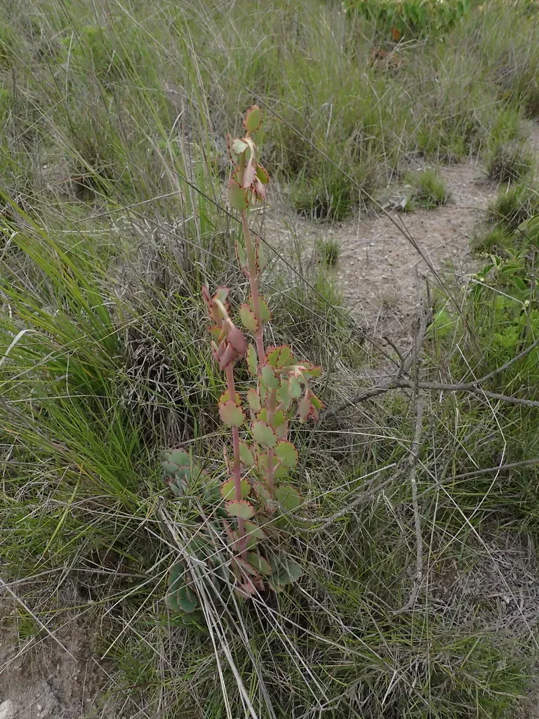 Kalanchoe laxiflora is a succulent shrub native to eastern central Madagascar, known for its erect woody stems and fleshy, green to bluish-green leaves with red edges.