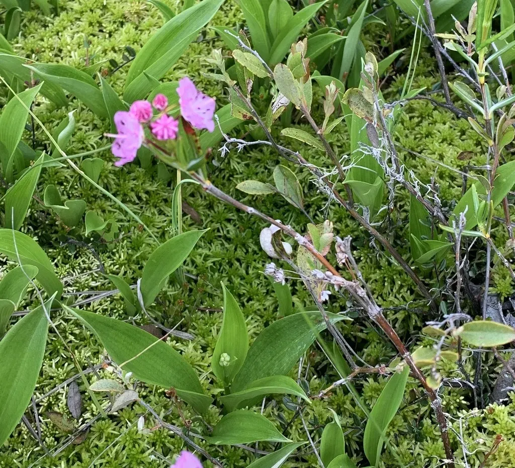 Kalmia polifolia is a low, evergreen shrub native to northeastern North America, typically found in cold acidic bogs. It has glossy, leathery, dark blue-green foliage and bright pink to purple flowers.