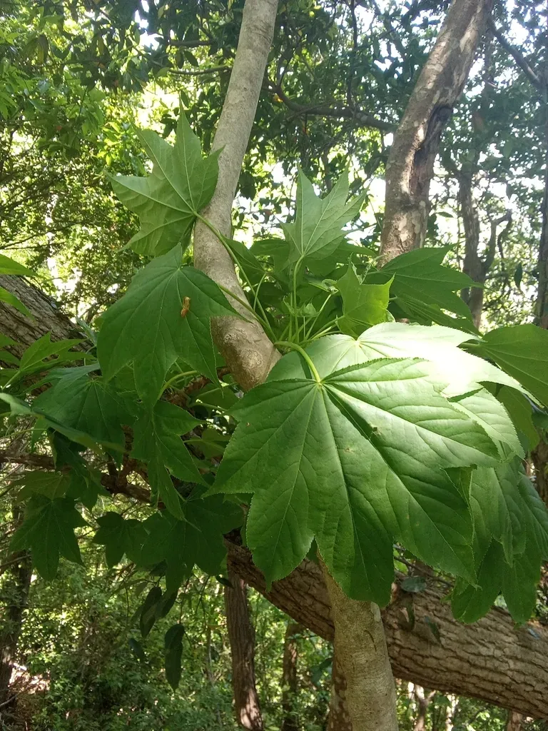 Kalopanax septemlobus is a deciduous tree known for its large, palmate leaves resembling those of the castor bean plant, thorny stems, and clusters of showy white flowers followed by black fruits.