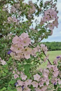Karomia speciosa is an African deciduous large shrub or bushy tree up to 7 m, known for its clusters of deep mauve-blue flowers with paperlike texture.