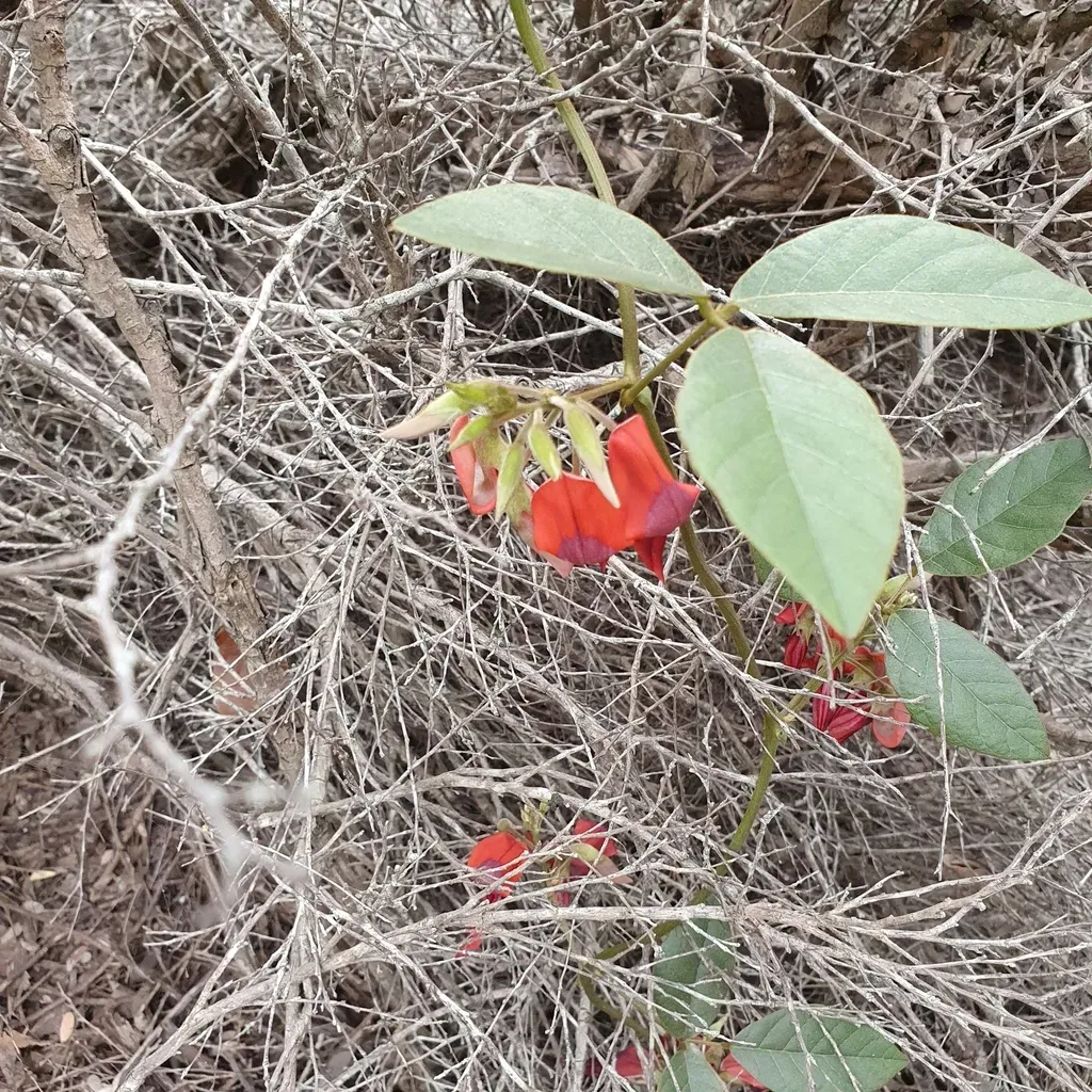 Kennedia rubicunda is a vigorous climbing or groundcover perennial native to eastern Australia, known for its bright red pea flowers and trifoliate hairy leaves.