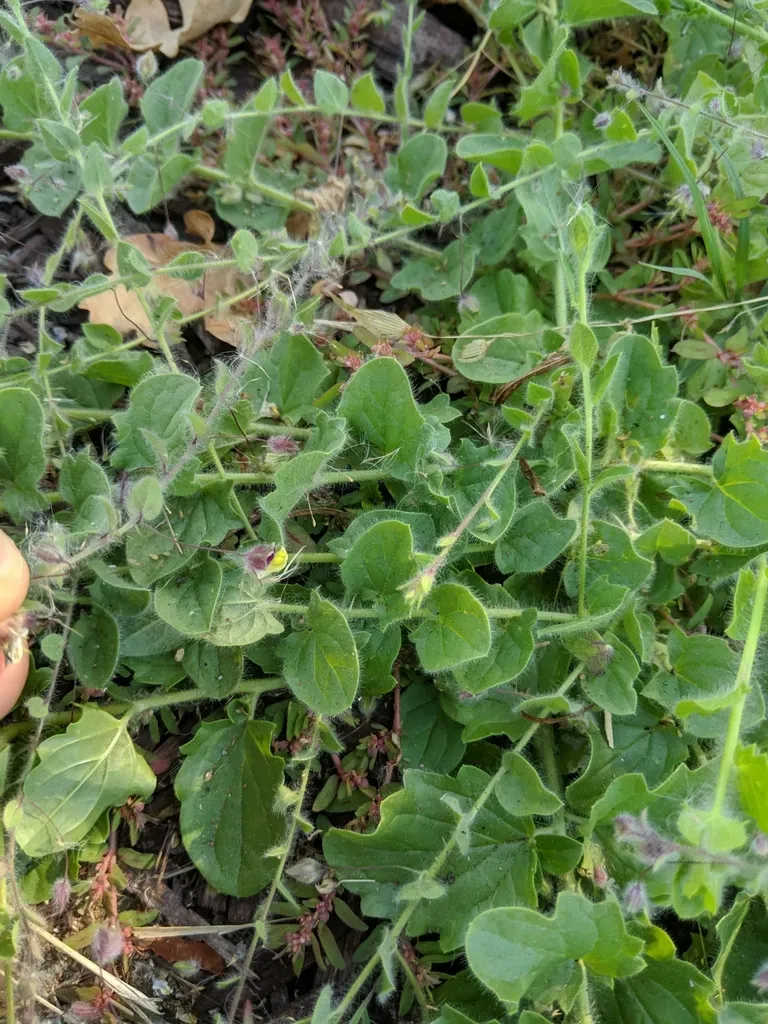 Kickxia elatine is a low-growing annual herbaceous plant with sharply triangular leaves and distinctive yellow and purple flowers.