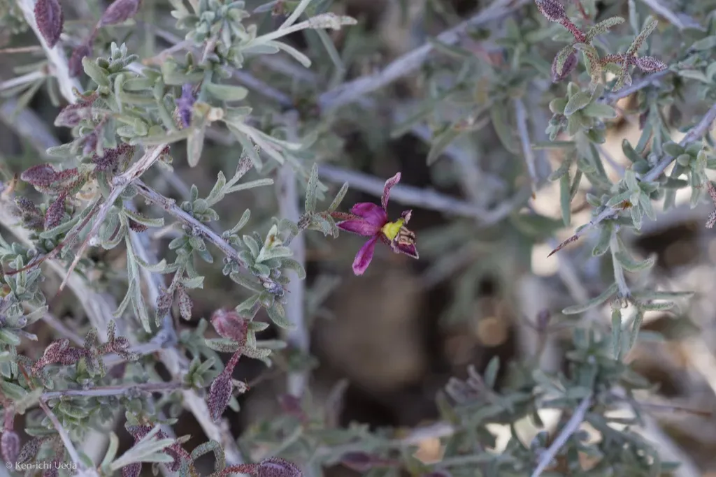 Krameria erecta is a low, grayish, intricately branched shrub with bilaterally symmetrical reddish-lavender flowers, native to arid regions of western North America.
