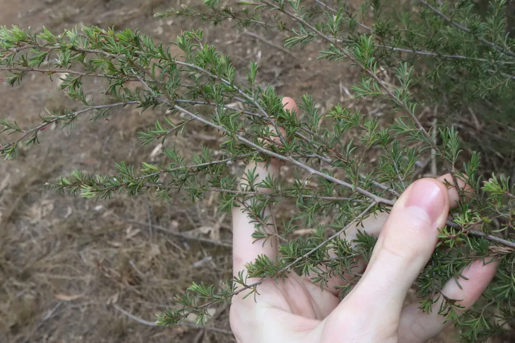 Kunzea ambigua is an upright evergreen shrub native to eastern Australia, known for its white flowers and fibrous bark.
