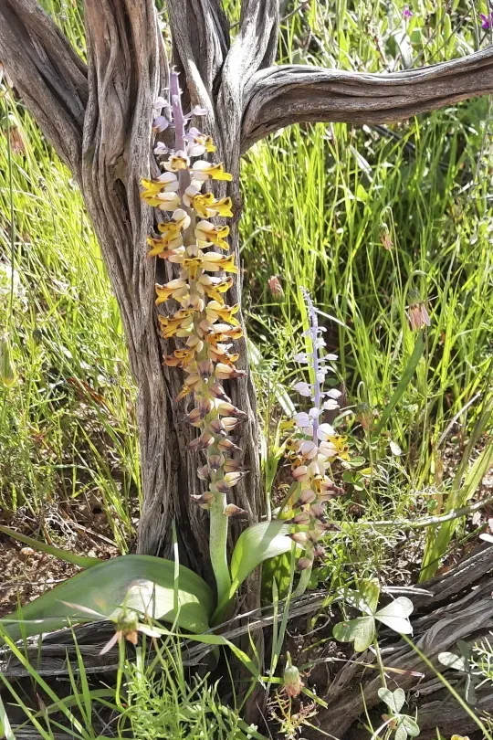 Lachenalia mutabilis is a perennial herbaceous plant native to South Africa, known for its vibrant, tubular flowers that change color from blue to mauve and then yellow.