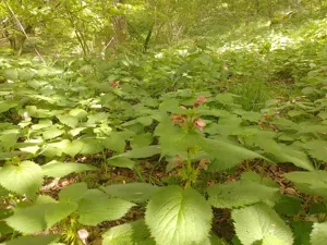 Lamium orvala is a herbaceous perennial known for its large, heart-shaped, finely serrated green leaves and attractive flowers.