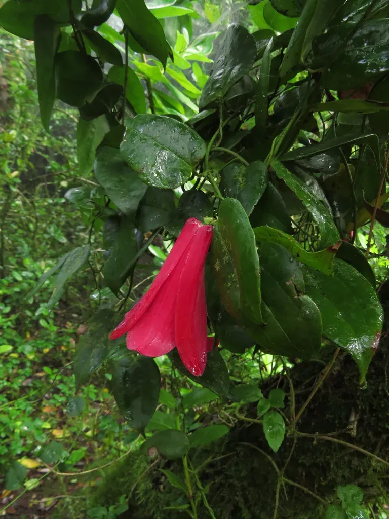 Lapageria rosea is an evergreen climbing vine native to Chile, known for its large, bell-shaped, waxy flowers that are typically deep rose-pink.
