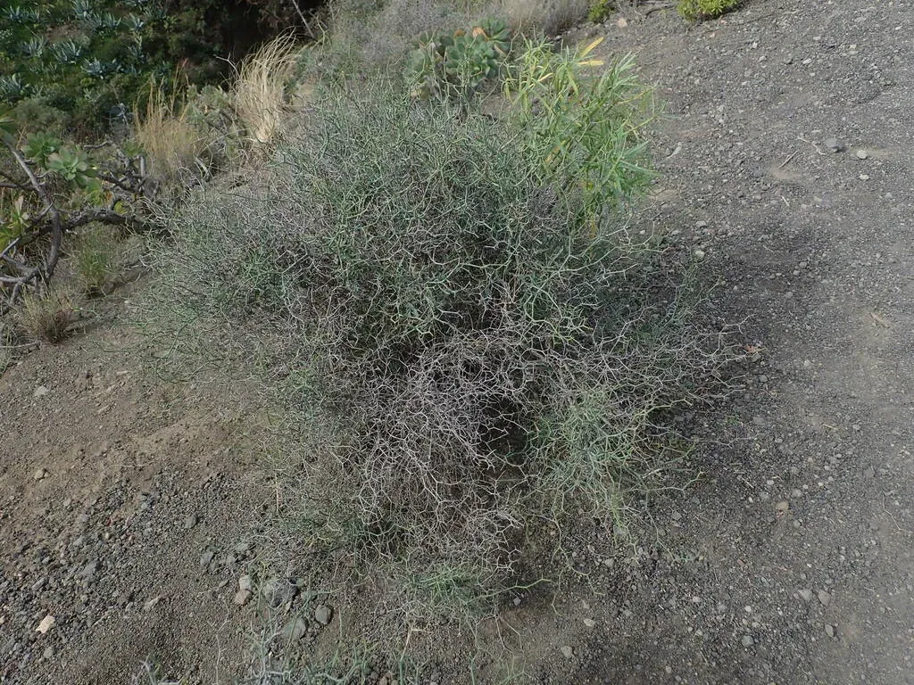 Launaea arborescens is a medium-sized, thorn-bristled shrub native to Macaronesia, Western Mediterranean to Mauritania and Saudi Arabia, typically found in desert and dry shrubland biomes.
