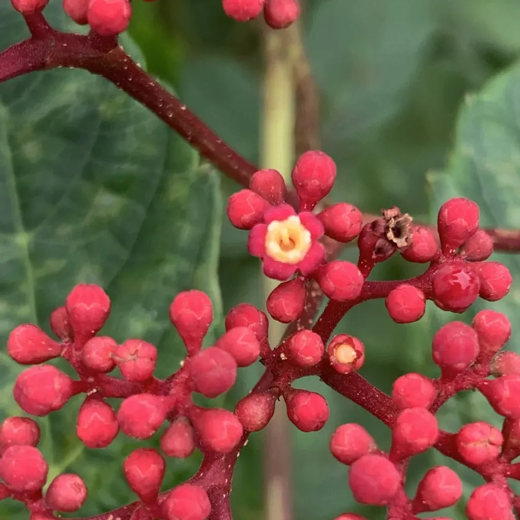 Leea rubra is a perennial shrub known for its bright red stems and pinnate leaves, growing up to 3 meters tall.