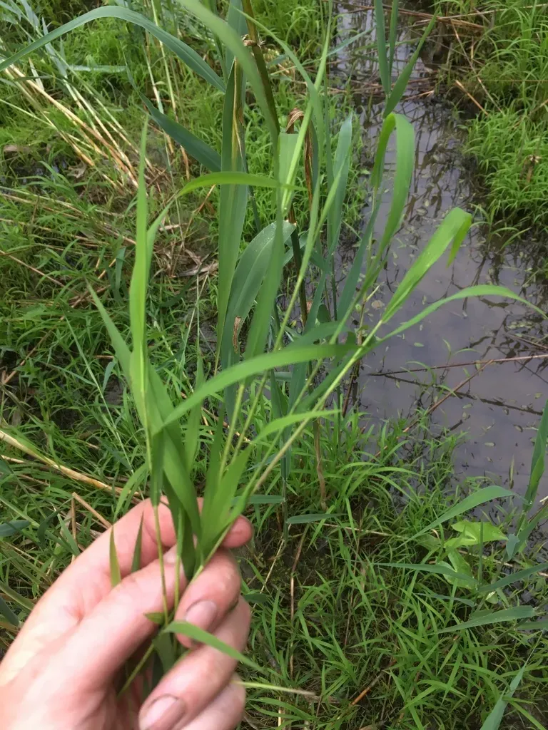 Leersia oryzoides is a perennial grass commonly found in wetlands and along shorelines, known for its sharp-edged leaves and rice grain-like spikelets.