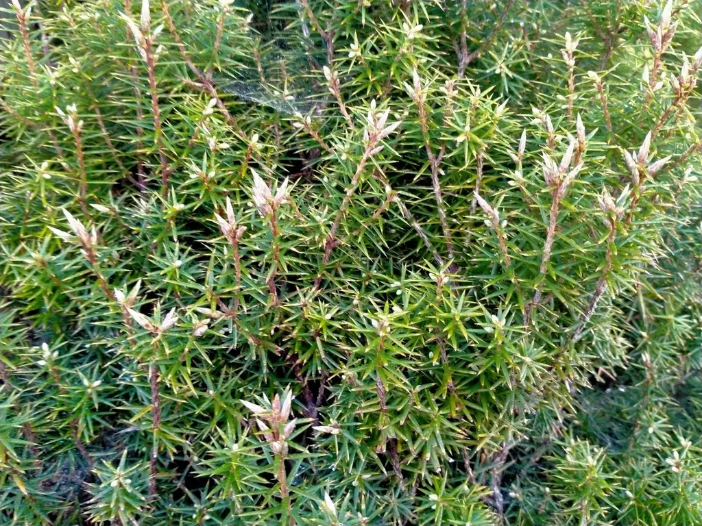Leptecophylla juniperina is a bushy, prickly shrub native to Australasia, known for its hard narrow sharp leaves and colorful fruits ranging from pink to red-black.