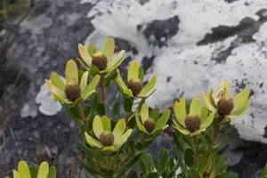 Leucadendron strobilinum is a large, single-stemmed shrub native to the Cape Peninsula in South Africa, known for its attractive foliage and cream-yellow flowers.