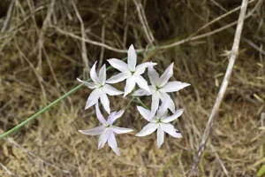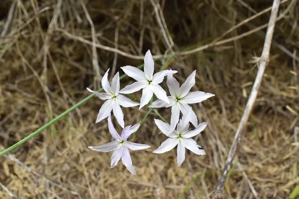Leucocoryne ixioides is a bulbous perennial plant native to central Chile, known for its delicate white star-shaped flowers with lilac purple tips.