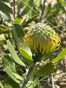 Leucospermum praecox is an evergreen, rounded, upright shrub with striking pincushion flowers.