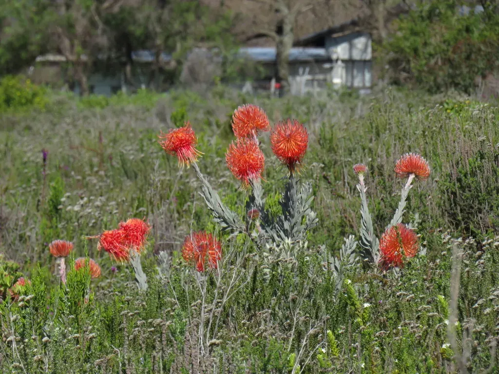 Leucospermum reflexum is a large, rounded evergreen shrub known for its spectacular reddish-orange pincushion flowers and silvery grey foliage.