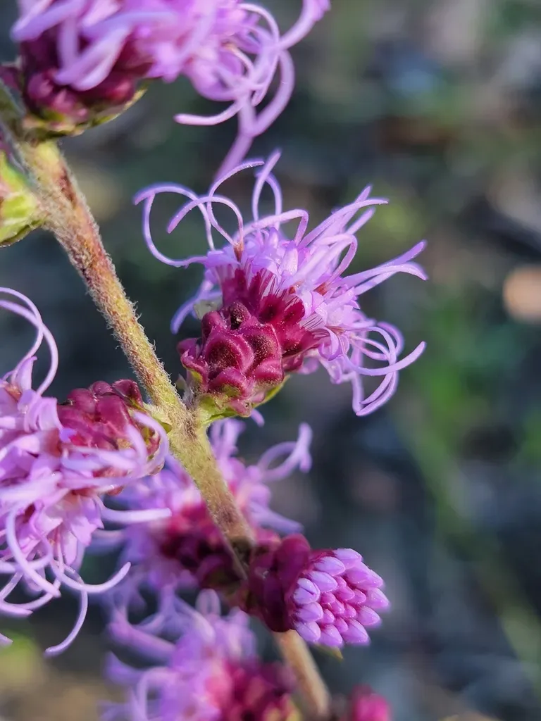 Liatris aspera is a native North American perennial known for its upright, clump-forming habit and tall spikes of purple flowers.