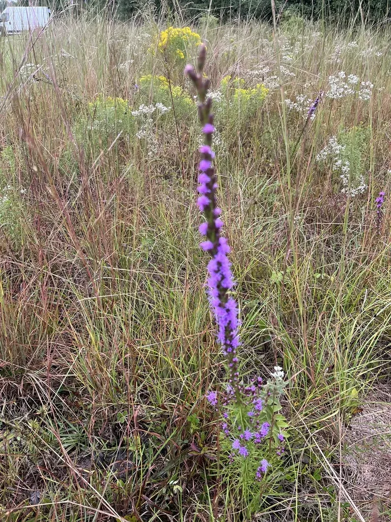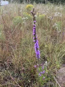 A graceful perennial wildflower with narrow, grass-like foliage and spikes of purple flowers blooming late summer to early fall.
