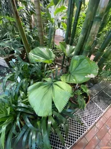 Ruffled Fan Palm (Licuala Grandis) is a perennial palm in the Arecaceae family with moderate care difficulty. It requires moderate watering and partial shade or full shade or filtered_light light in USDA hardiness zones 10-12. This plant is safe for cats and dogs.