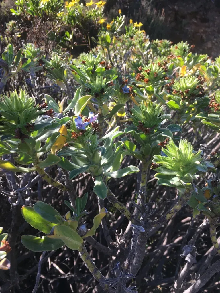 Lobostemon montanus is a South African shrub known for its turquoise flowers and silvery hairy leaves, commonly found in mountainous terrains.