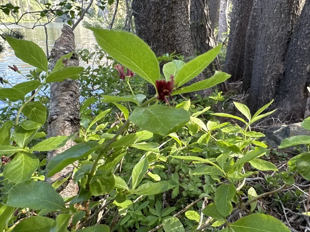 Lonicera conjugialis is a slender shrub native to the western United States, known for its maroon to deep purple paired flowers and bright red berries.