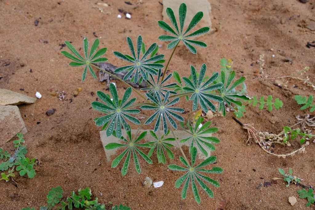 Lupinus cosentinii is a large, upright, short-lived herbaceous plant native to Mediterranean climates, typically growing between 0.2 to 1.2 meters tall.