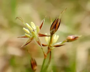 A perennial wood-rush native to Europe, North Africa, and western Asia, forming clumps of grass-like foliage and bearing small brown flowers.