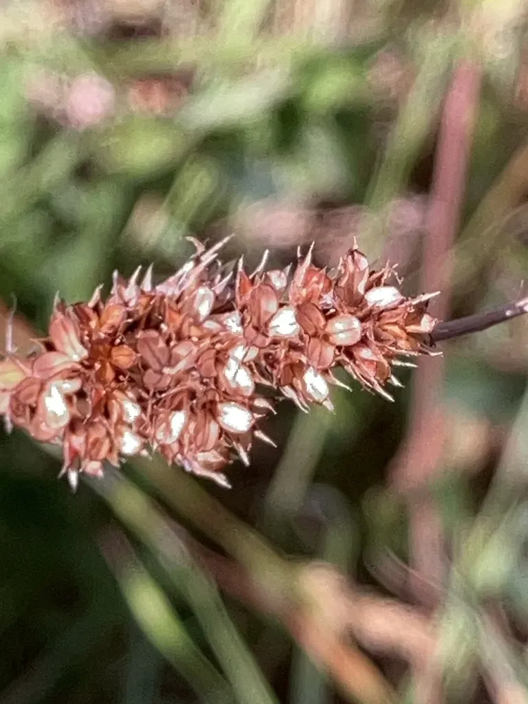 Luzula subsessilis is a perennial grasslike herb native to California, characterized by soft green leaves with blunt tips and fine hairs, growing wiry stems with tawny black flowers in spring.