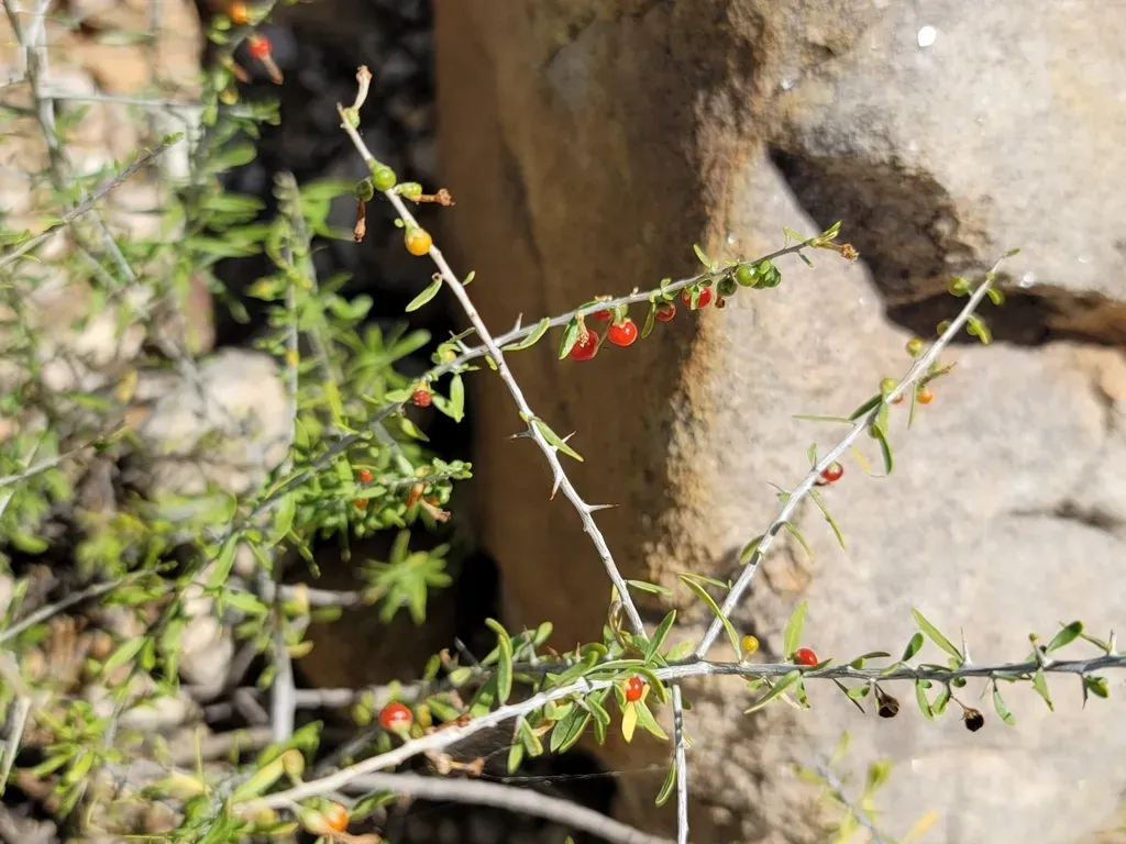 Lycium berlandieri is a spiny, deciduous shrub native to the southwestern United States and northern Mexico, typically growing up to 2 meters tall with thorny branches and red berries.