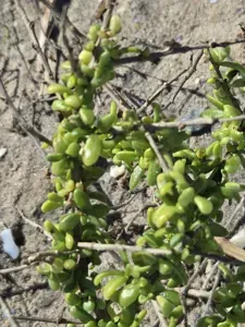 Lycium tetrandrum is a much-branched shrub with firm branches ending in thorns, bearing small, fleshy, tightly clustered yellow-green leaves.