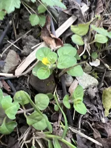 An extremely low-growing, creeping ground cover with tiny oval green leaves and small yellow star-shaped flowers.