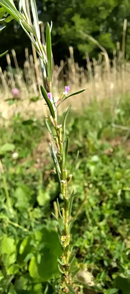 Lythrum hyssopifolia is a mostly upright, branching annual or biennial herb growing 10 to 60 centimeters tall with oval leaves and small purple-pink flowers.
