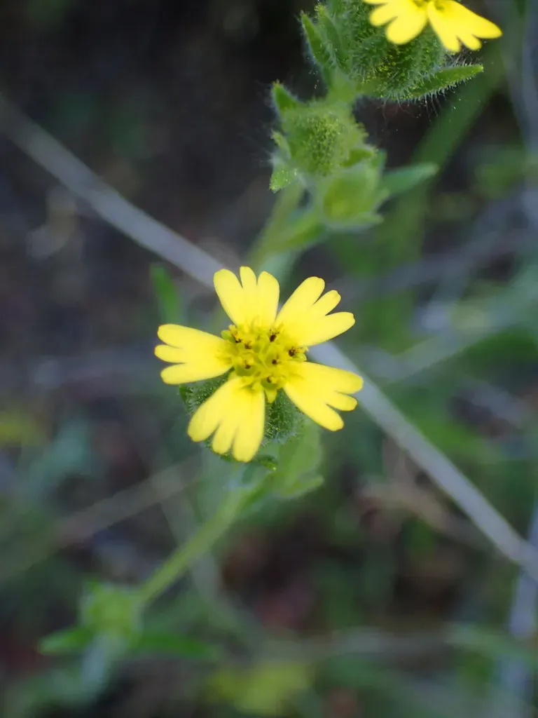 Madia gracilis is an annual herb native to California and parts of the western United States, characterized by its branching, hairy, and glandular stems and yellow flowers.