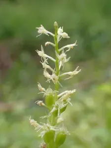 Malaxis monophyllos is a small terrestrial orchid species known as the white adder's mouth, found in wet habitats across Europe, Asia, and parts of North America.