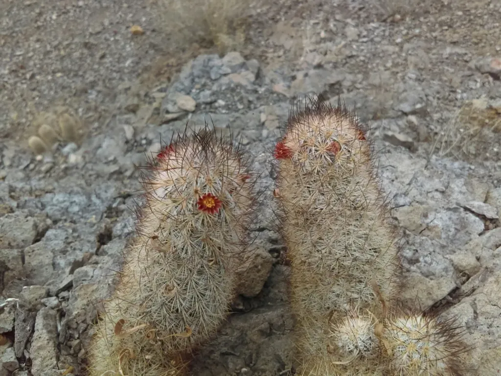 Mammillaria pottsii is a small, globular cactus native to desert and dry shrubland climates, known for its cylindrical red fruits and distinctive spiny appearance.