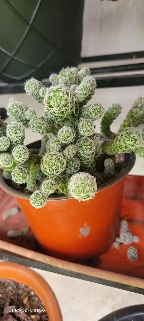 Mammillaria vetula is a small, globular cactus native to Mexico, known for its dense clusters of small, cylindrical stems covered in white spines.