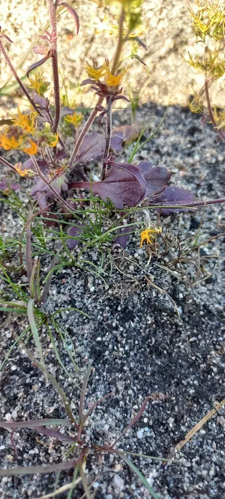 Manulea cheiranthus is a glandular-hairy plant with toothed leaves mainly at the base and orangish flowers with narrow petals borne in racemes.