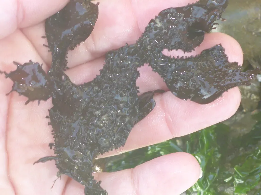 Mastocarpus papillatus is a species of red algae commonly found in the Pacific Northwest, known for its dark, leathery texture and distinctive papillae on its surface.