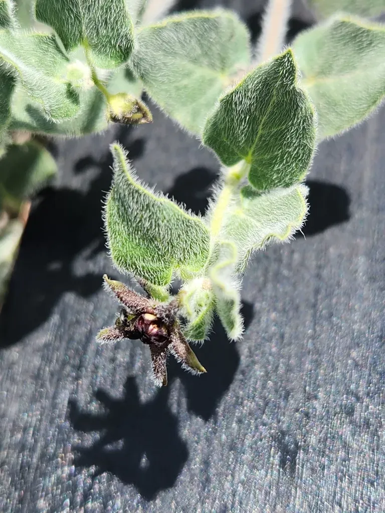 Matelea biflora is a trailing vine known for its distinctive five-petaled star-shaped deep purplish-brown flowers.