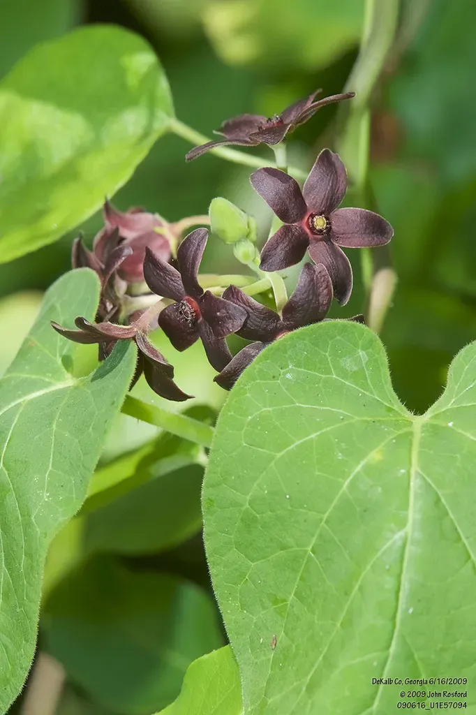 Maroon Carolina Milkvine (Matelea Carolinensis) is a perennial vine in the Apocynaceae family with easy care difficulty. It requires moderate watering and full sun or partial shade light in USDA hardiness zones 6-8. This plant is safe for cats and dogs.