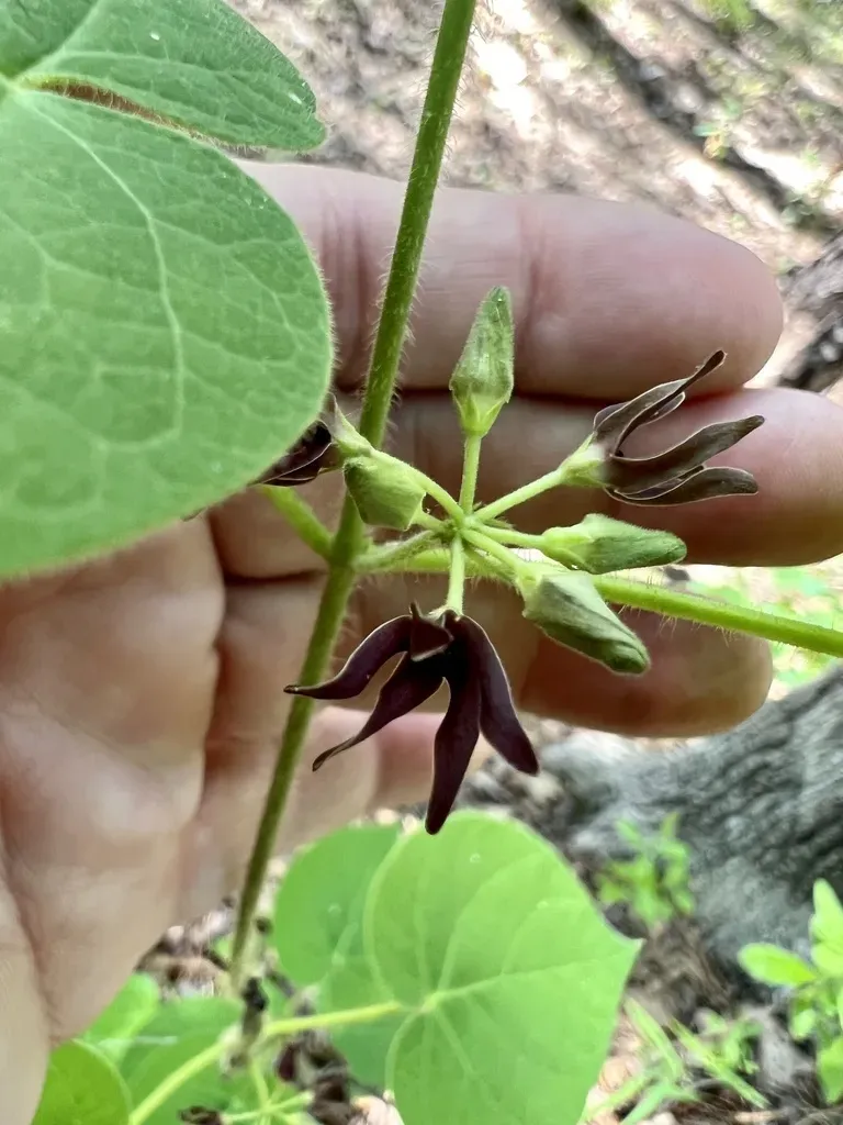 Matelea decipiens is a perennial twining vine with milky sap, heart-shaped leaves, and dark maroon star-shaped flowers.