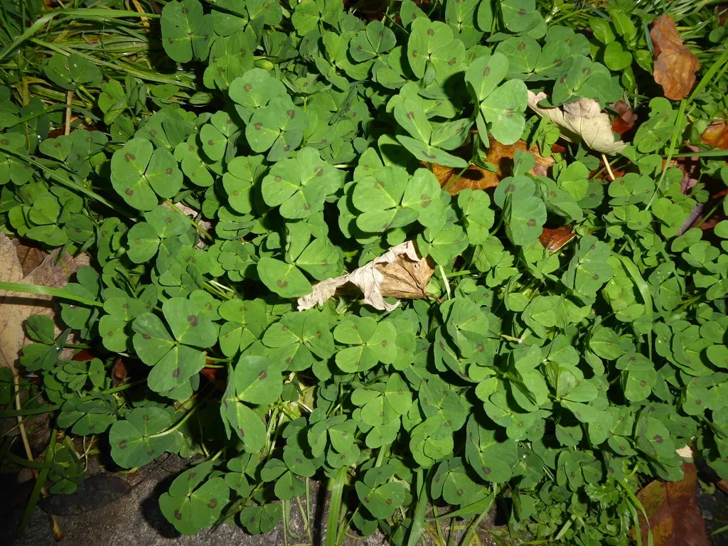 A low-growing annual legume with trifoliate leaves marked by dark spots and small yellow flowers.