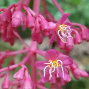 Medinilla magnifica is a tropical evergreen shrub known for its large, striking pink flower clusters and glossy dark green foliage.