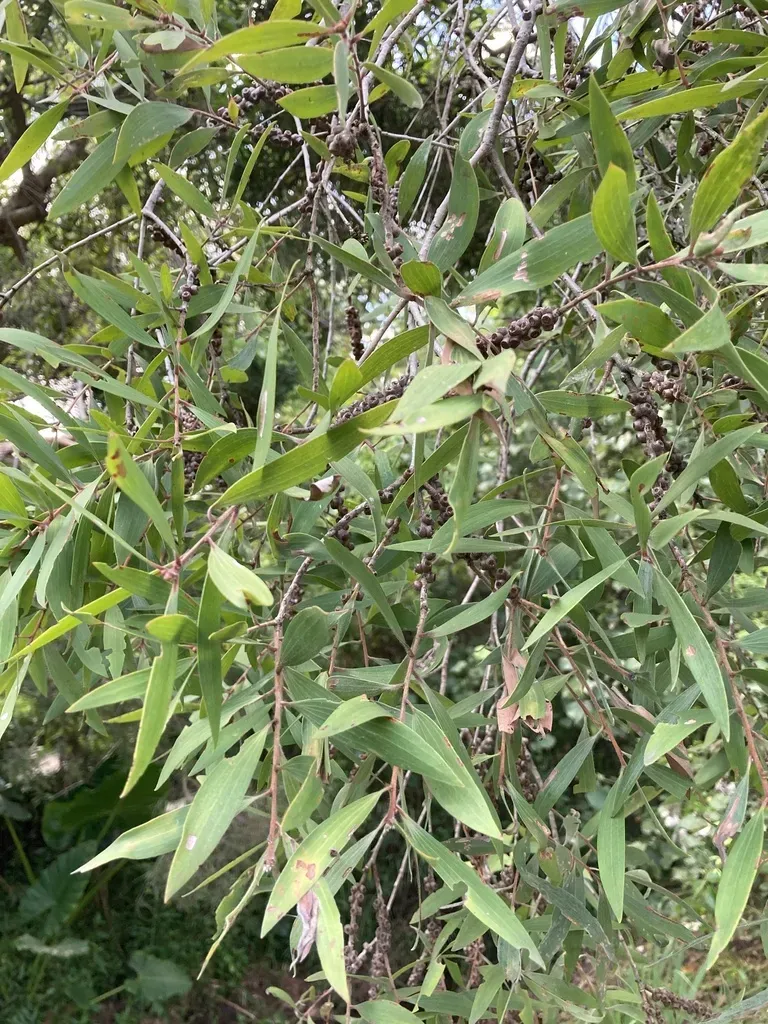 Melaleuca leucadendra is a fast-growing evergreen tree known for its distinctive white papery bark and long, narrow leaves. It produces creamy white flowers and woody fruit capsules.