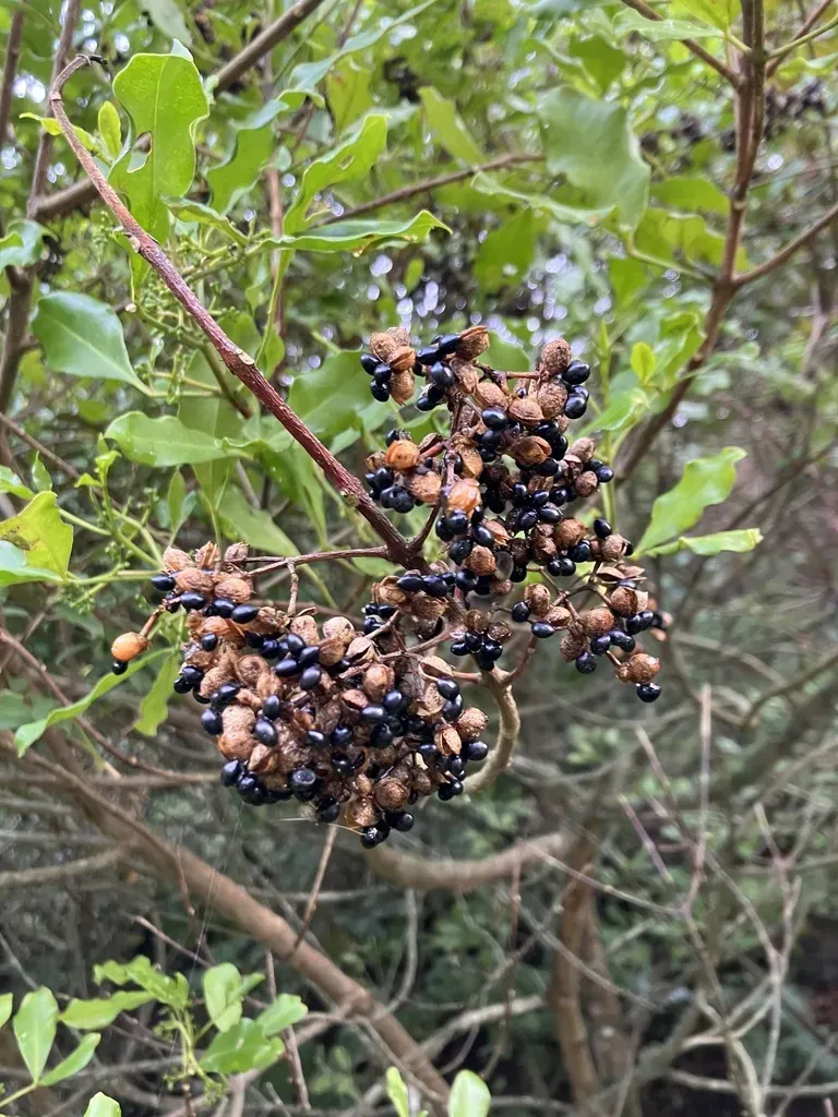 An evergreen shrub or small tree with glossy trifoliate leaves and clusters of dry fruit enclosing shiny black seeds.