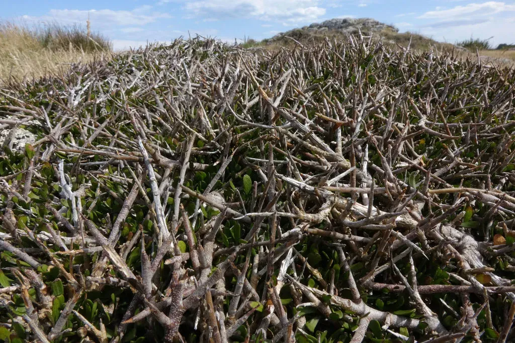Melicytus alpinus is a small, evergreen shrub endemic to New Zealand, known for its distinctive spiny foliage and yellow spring flowers followed by white fruit.