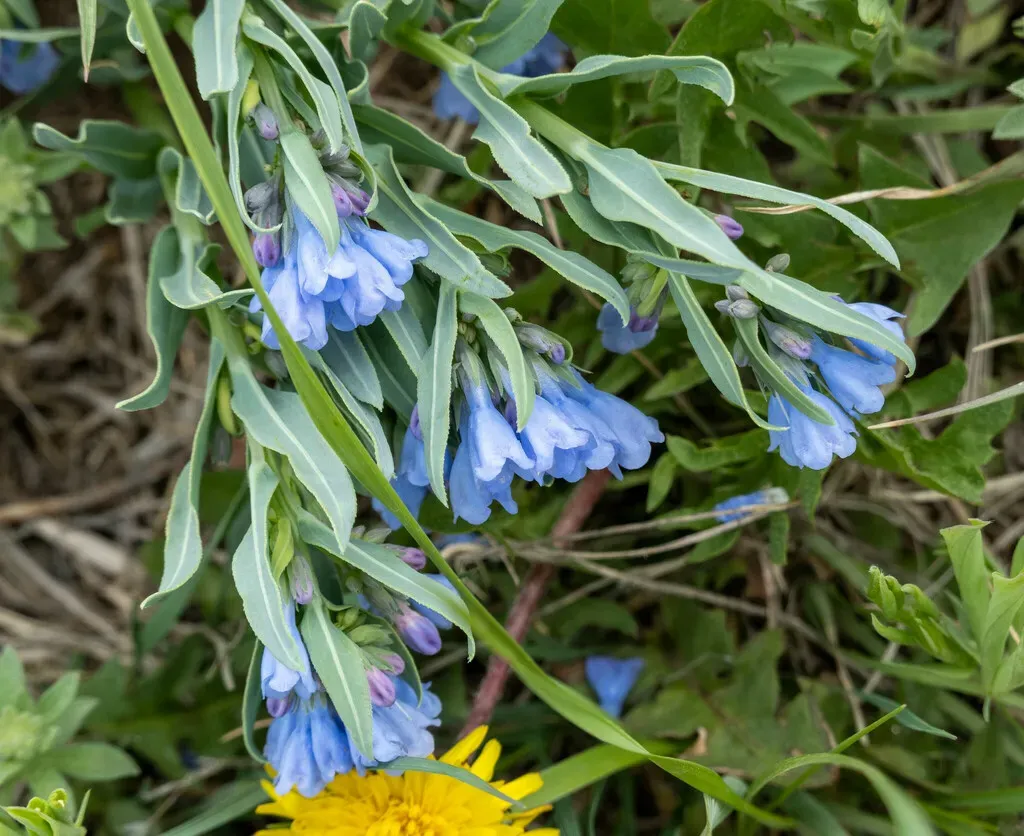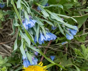 Mertensia lanceolata is a perennial herbaceous plant native to the Rocky Mountain region, known for its blue-green lance-shaped leaves and clusters of bell-shaped blue flowers.