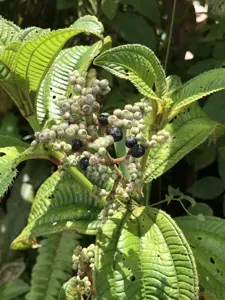 Miconia racemosa is an evergreen shrub or small tree that typically grows 2 to 3 meters tall with stems about 3 to 5 cm in diameter.