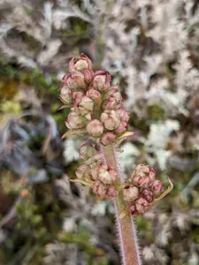 Micranthes hieraciifolia is a perennial herbaceous plant native to subarctic and subalpine regions, characterized by a basal rosette of thick, oblong to rhombic leaves and a stout, glandular flowering stem.