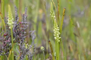 Microtis media is a terrestrial orchid species endemic to southwestern Australia, known for its single tubular leaf and numerous small yellowish-green flowers.