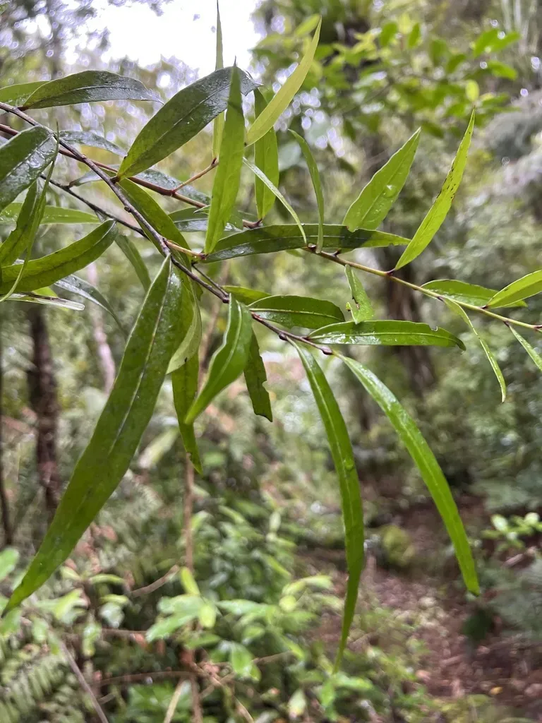 Mida salicifolia is a small hemiparasitic tree native to New Zealand, growing up to 6 meters tall with smooth grey bark and slender brittle branchlets.